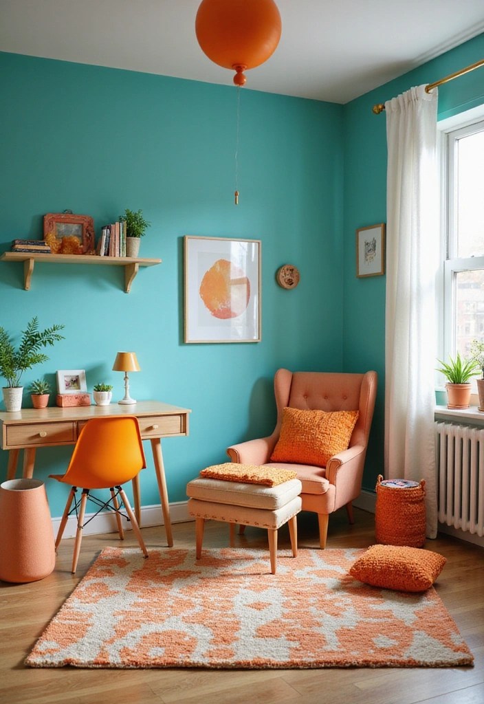Imagine turquoise walls with tangerine accents in decor, artwork, or even furniture—it’s a combo that screams fun!