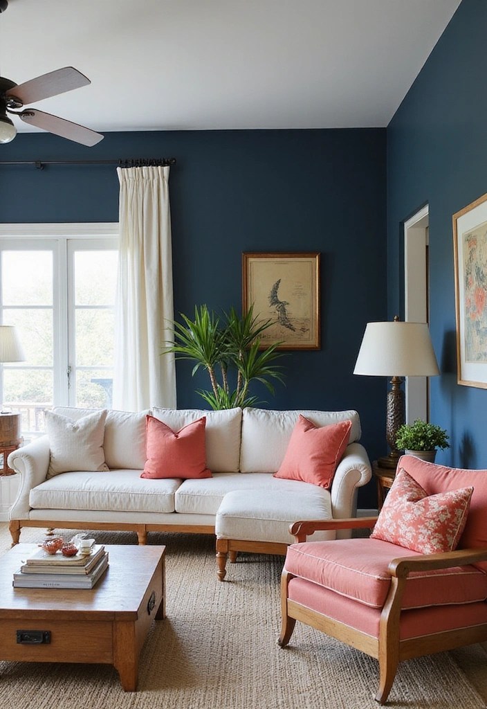 Deep navy walls can provide a dramatic backdrop, while coral accents in artwork or cushions bring warmth and brightness.