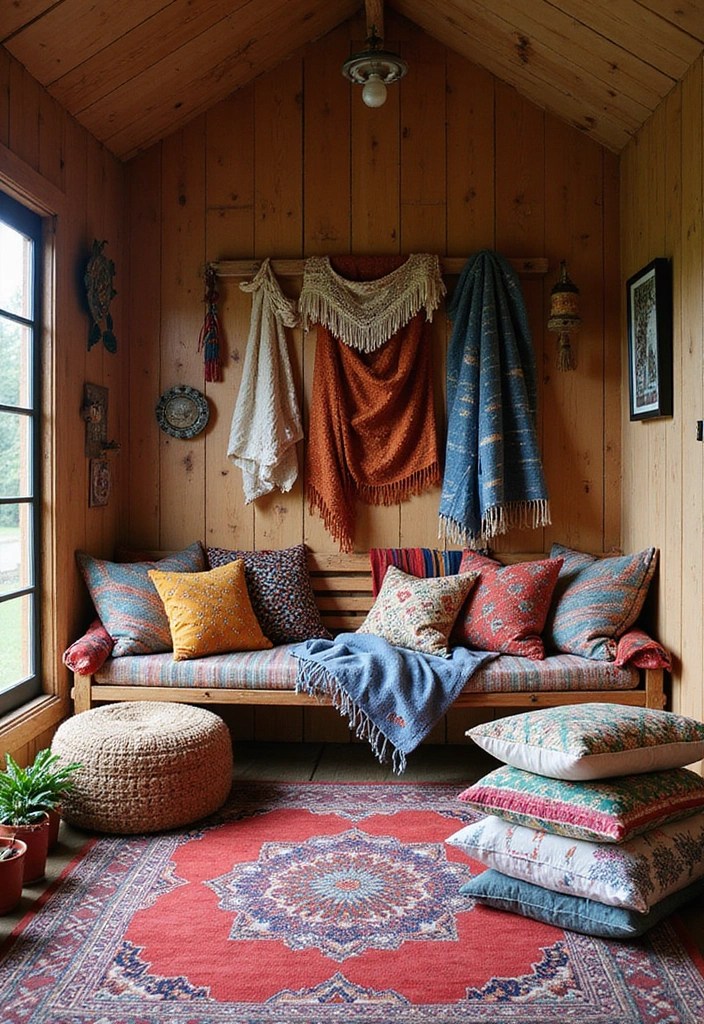 Want a bohemian she shed that feels warm and welcoming? Layered textiles are your fastest route.
