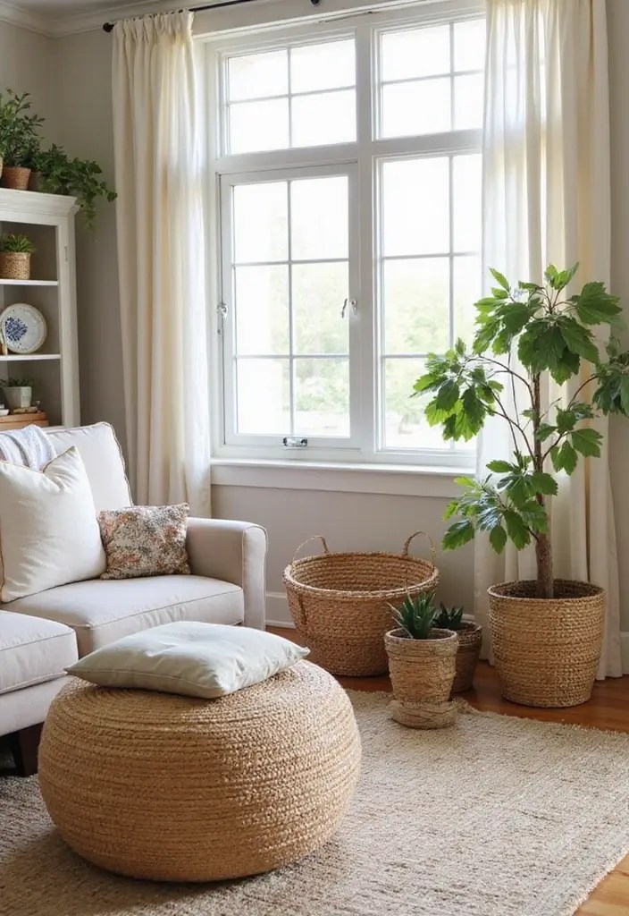 Start with essentials you can reach from the couch. Woven baskets, fabric bins, and storage ottomans all fit the bill. They hold throws, board games, remotes, and seasonal decor neatly out of sight. Pick pieces that suit your space and your style so your room stays cohesive.