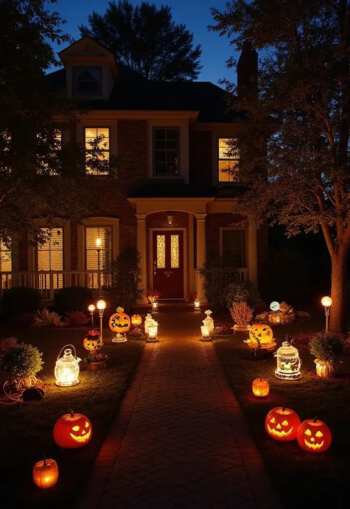 – Pathway setup Line up several lanterns along a path or porch to guide guests with a soft eerie glow.