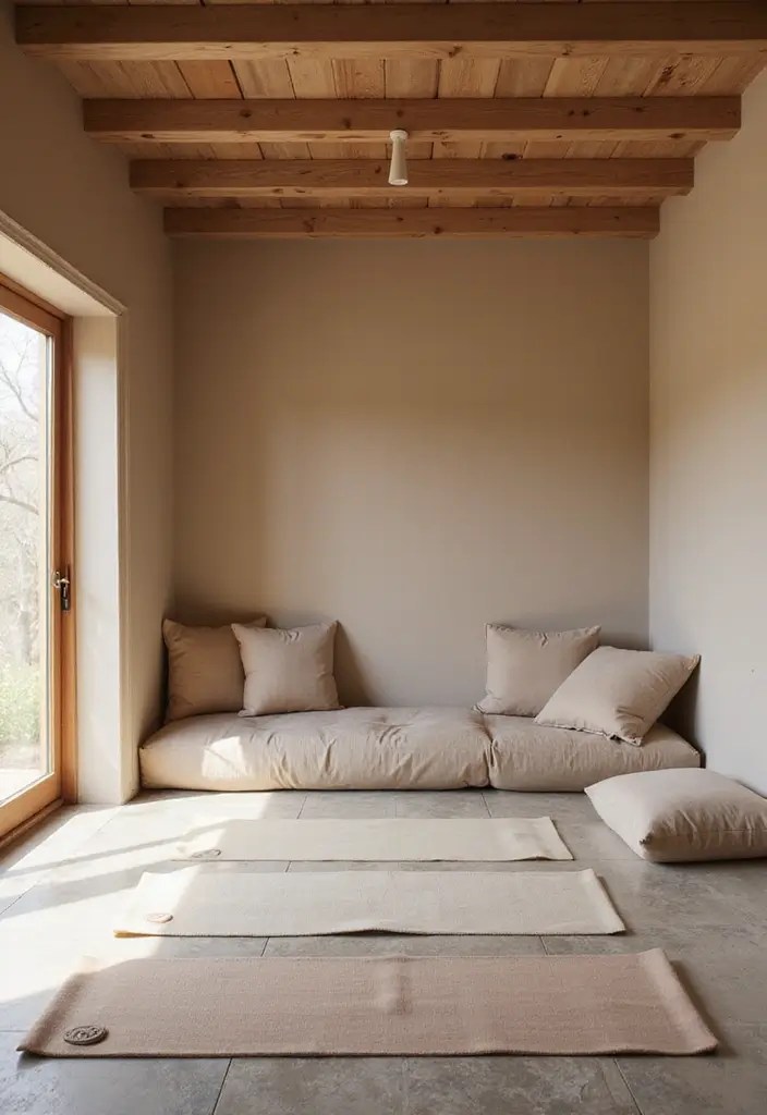 A yoga mat, plush cushions, and soft lighting invite slow movement or quiet stillness.