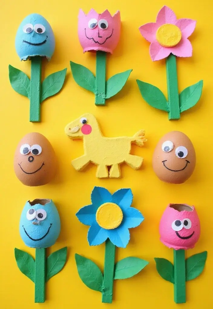 – Create a wall display of different egg carton flowers for a cheerful decor.