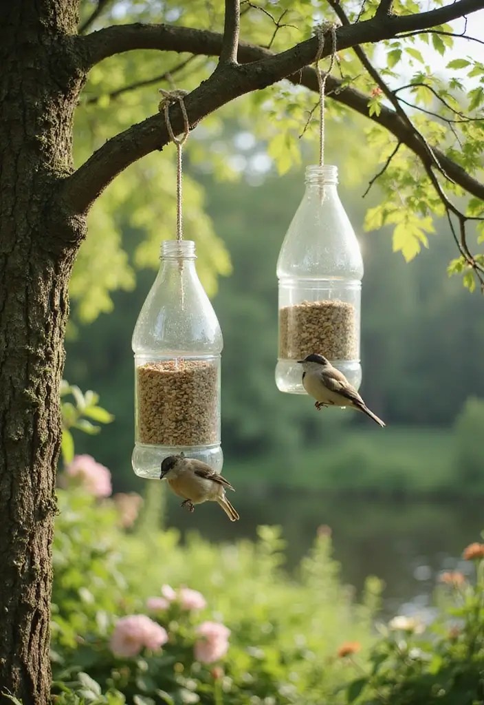 Wrap natural twine around the bottle or paint with bright, non-toxic colors. Place the feeder in dappled shade rather than full sun to keep seeds fresh longer.